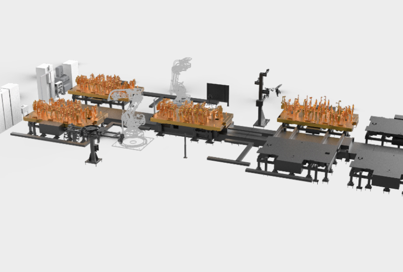 通過轉臺及夾具庫切換技術,實現側圍線多車型混線生產。側圍線內采用工業機器人,積放式輸送機等自動化設備,實現焊接、涂膠、搬運等全自動化生產。